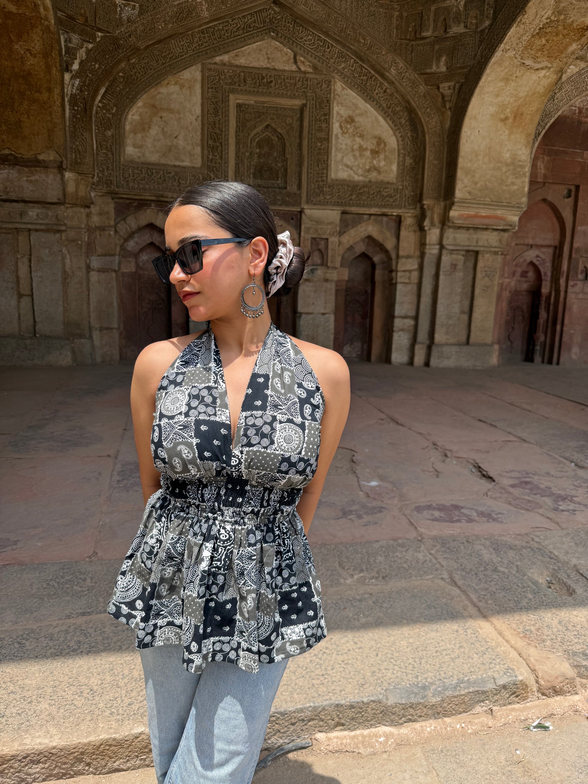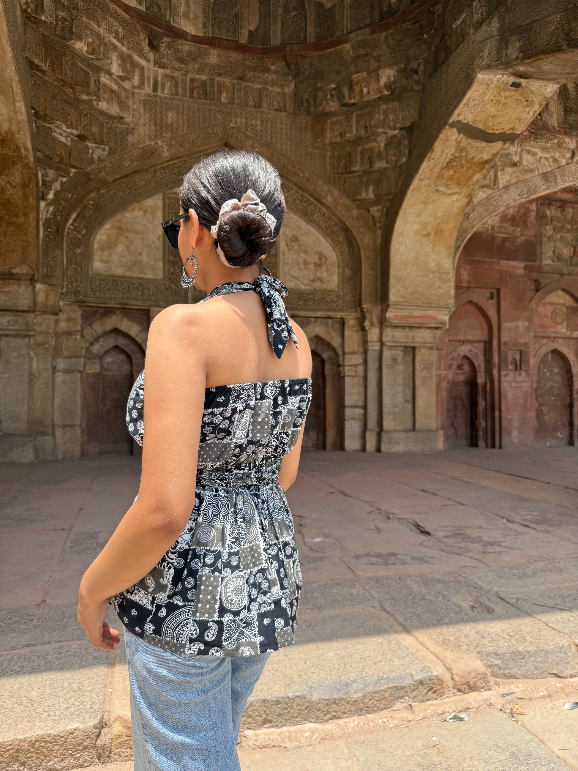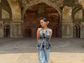 Say hello to elevated summer style with our Raahi halter neck peplum kurti — a standout piece that blends heritage charm with a bold, modern cut. Crafted from breathable pure cotton, this top features a mix of hand block-inspired prints in a monochrome palette. The halter neckline ties at the back with an elegant bow, while the cinched waist flares out into a soft peplum, enhancing your silhouette effortlessly. Whether you’re exploring heritage sites or heading to a café, Raahi keeps you cool, confident, and stylishly unique.