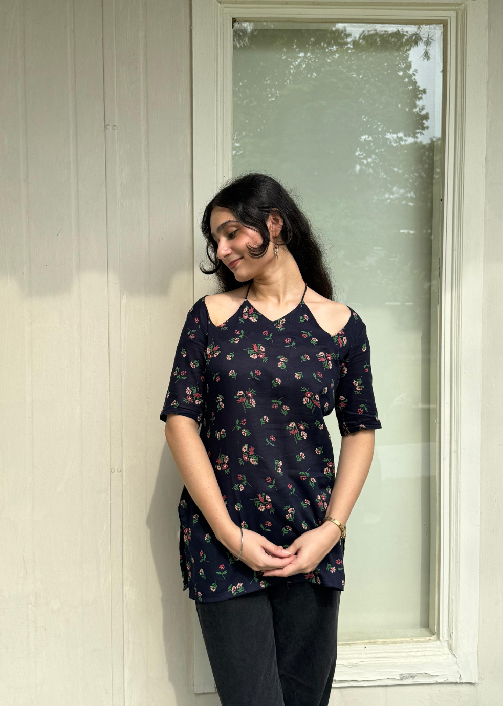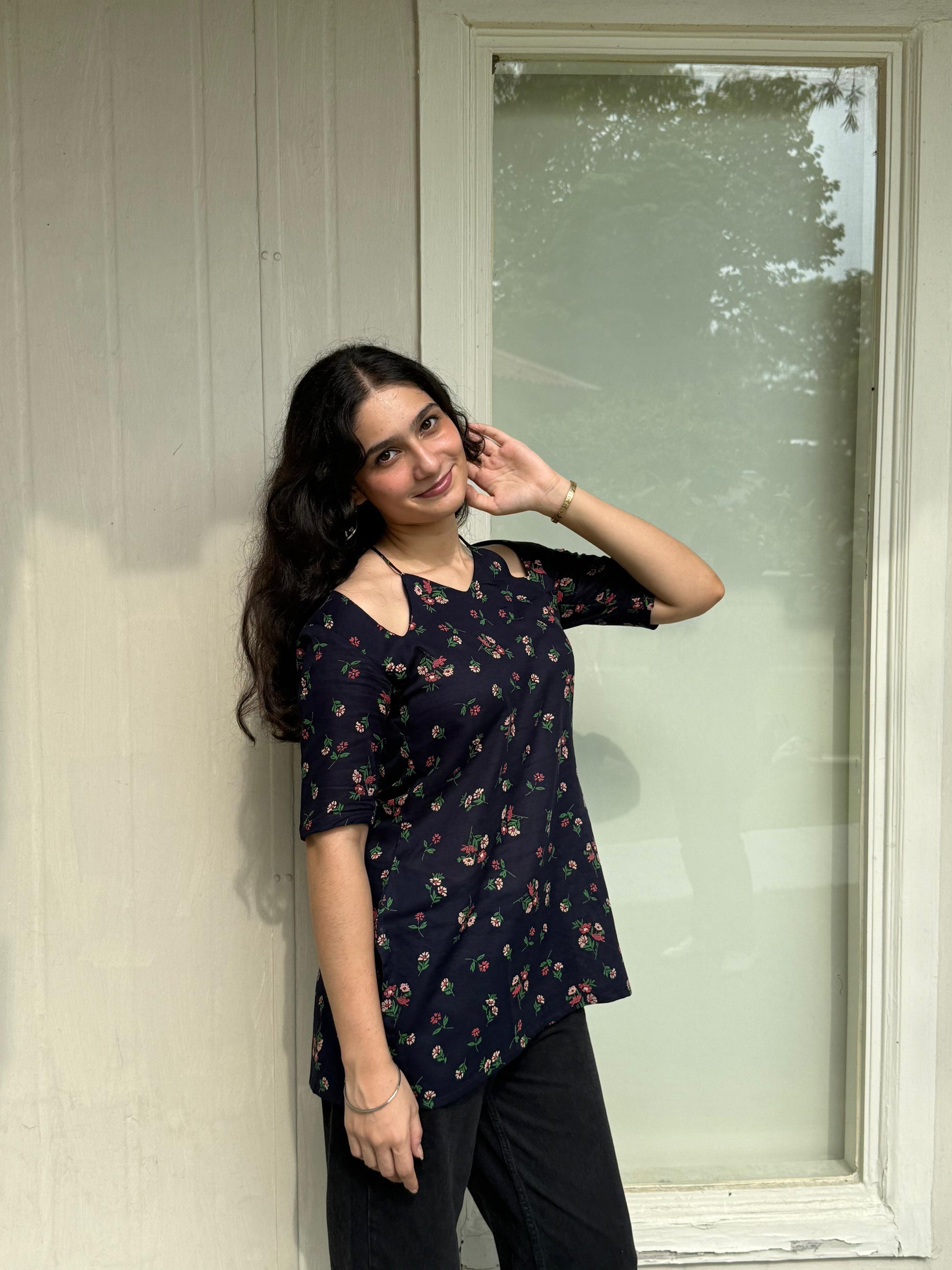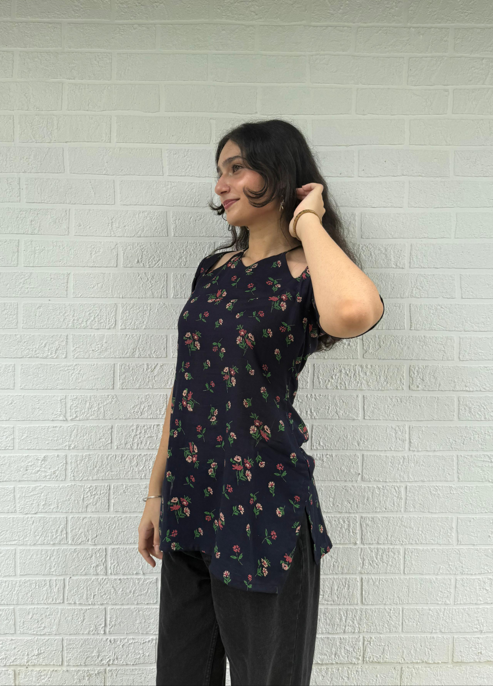 Step into a garden of soft rebellion with our sanjh Cold-Shoulder Kurti .A striking fusion of feminine florals and fierce cuts. Designed in lightweight, breathable cotton, this kurti features cold-shoulder cut-outs that add just the right amount of sass to its sweet floral charm. The slightly cinched waist offers a flattering fit, while the playful silhouette keeps things breezy and effortless. Perfect for café dates, college days, or spontaneous photo walks — sanjh is a bold little bloom in your everyday wardrobe.